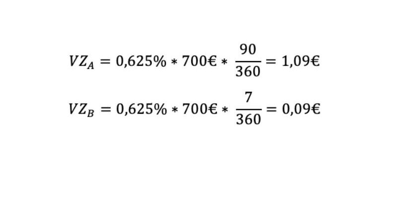 Die Vorschusszinsen VZ ergeben sich dann als Produkt aus Vorschusszinssatz Zvor, vorschusszinsbelastetem Betrag K und dem Berechnungszeitraum t in Tagen, der auf 360 Tage bezogen wird.
